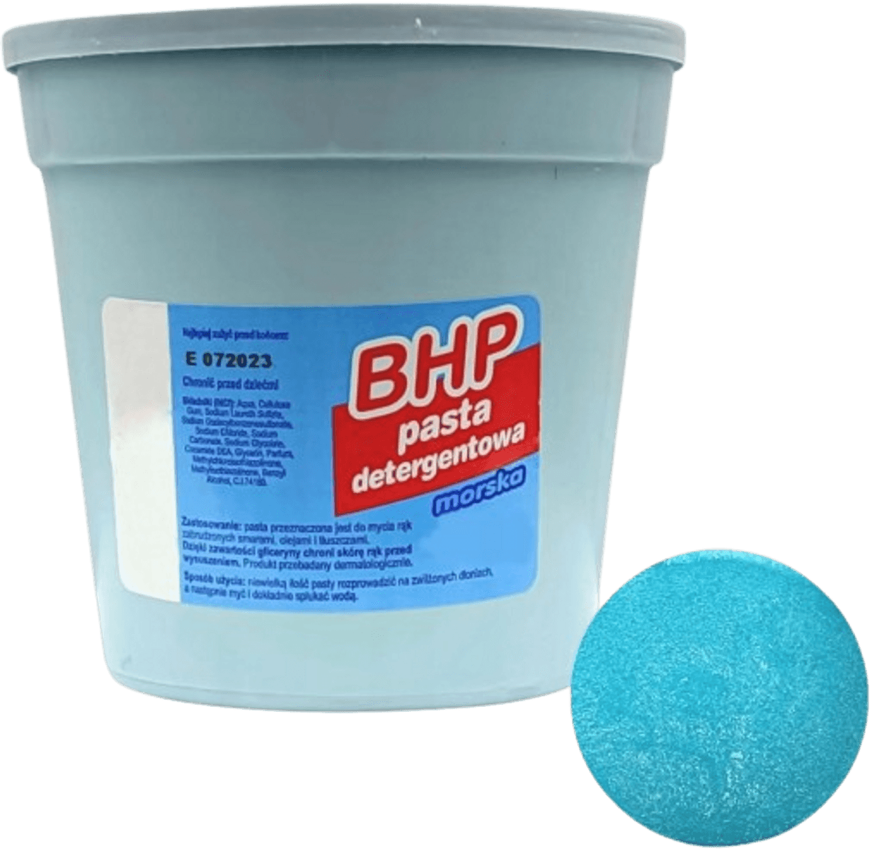 BHP Pasta Detergentowa Morska е високоефективна почистваща паста за ръце, създадена за премахване на упорити замърсявания като масла, грес, боя и индустриални замърсители. Подходяща е за ежедневна употреба в автосервизи, работилници, фабрики и строителни обекти. Пастата е нежна към кожата и оставя приятен морски аромат след измиване. Използва се без необходимост от специални разтворители – просто с вода.