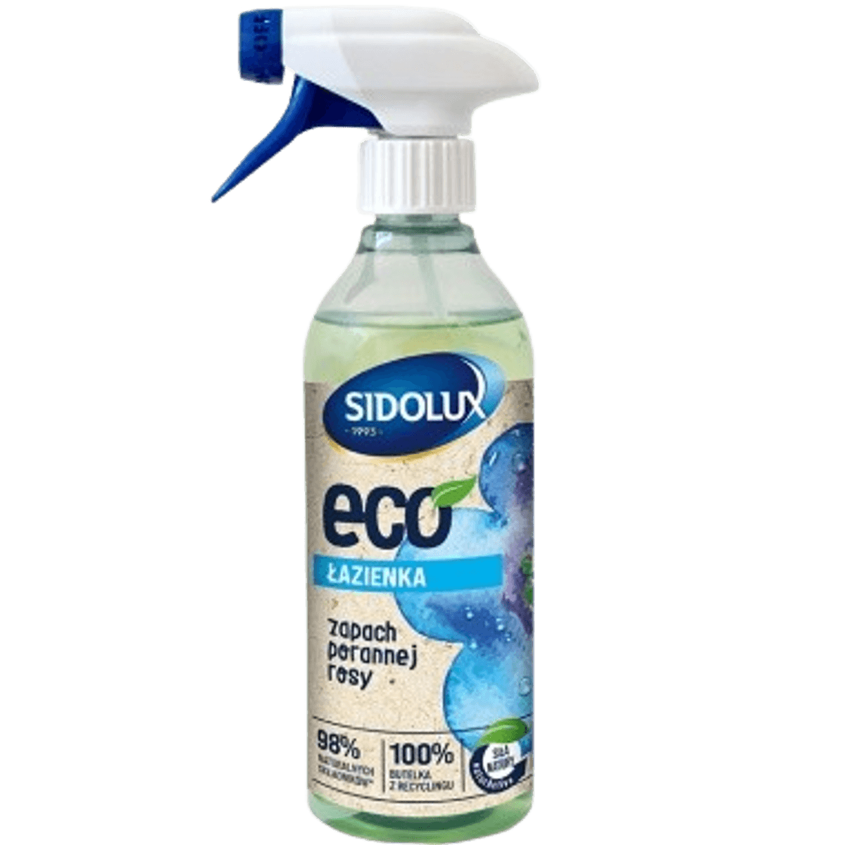 Sidolux ECO за баня е екологичен препарат, специално създаден за ефективно почистване на санитарни помещения. Благодарение на формулата с 98% натурални съставки, той безопасно и ефикасно отстранява варовик, сапунени отлагания и други замърсявания от мивки, вани, душ кабини, плочки и батерии. Ароматът на утринна роса придава усещане за свежест и чистота след всяка употреба. Бутилката е изработена от 100% рециклирана пластмаса, което прави продукта идеален избор за домакинства, стремящи се към устойчив начин на живот. Не оставя следи и не уврежда повърхности.