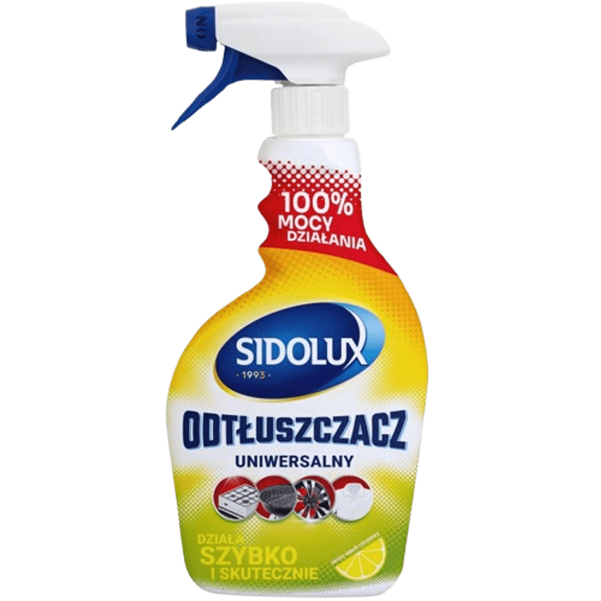 Sidolux Odtłuszczacz Uniwersalny е силно концентриран универсален обезмаслител, създаден за бързо и ефективно отстраняване на мазнини и упорити замърсявания. Подходящ е за използване върху кухненски повърхности, фурни, аспиратори, автомобилни части, джанти, инструменти и машини. Със 100% мощност на действие и свеж лимонов аромат, този препарат осигурява отлични резултати дори без търкане. Удобна спрей форма за лесна употреба.